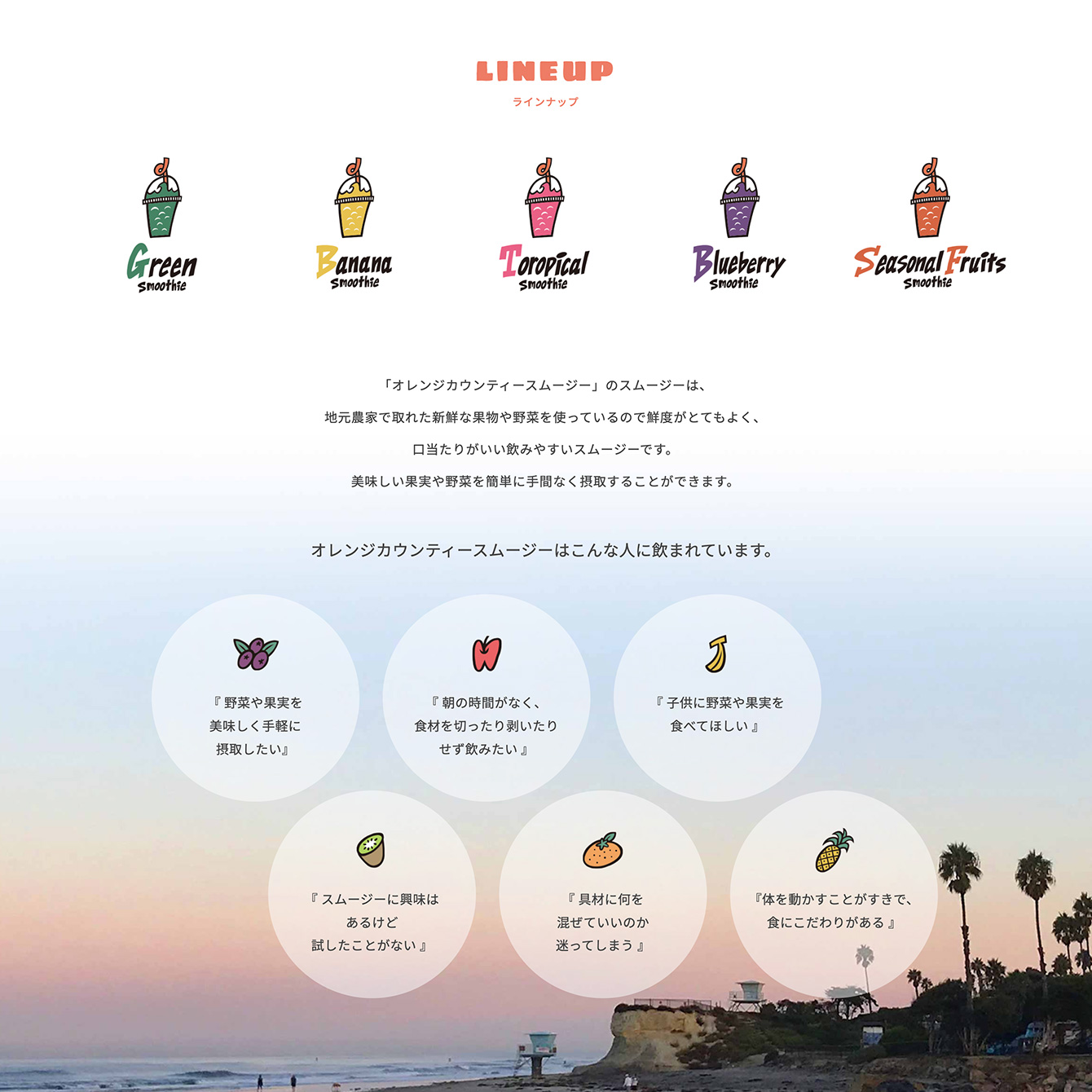 商品の新鮮さや健康的なイメージを伝えるために、淡いオレンジをキーカラーとして採用しました。柔らかな色合いが、視覚的にも心地よく、ナチュラルでヘルシーな印象を与え、訪れるユーザーに親しみやすさを感じてもらえるデザインを心掛けました。