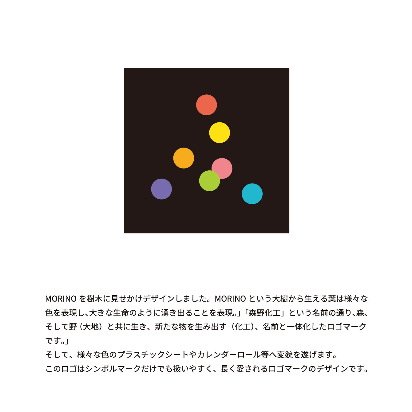 MORINOを樹木に見せかけデザインしました。MORINOという大樹から生える葉は様々な色を表現し、大きな生命のように湧き出ることを表現。 」「森野化工」という名前の通り、森、そして野(大地)と共に生き、新たな物を生み出す(化工)、名前と一体化したロゴマークです。」 そして、様々な色のプラスチックシートやカレンダーロール等へ変貌を遂げます。 このロゴはシンボルマークだけでも扱いやすく、長く愛されるロゴマークのデザインです。